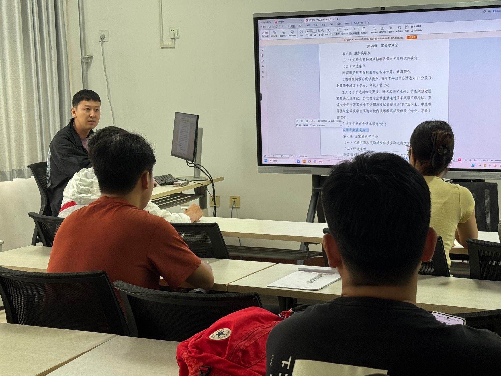 会议着重梳理了奖学金申请全流程规范,从前期材料准备、资格审核到评审公示各环节的操作要点。他强调,评定工作必须严格遵循"公平、公正、公开"原则,确保材料真实、程序合规、结果透明。针对学生干部提出的关于成绩核算、附加分认定等实操问题,现场进行了案例解析和答疑互动,帮助学生干部准确把握政策边界。